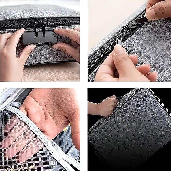 Máte obavy o bezpečnosť svojich dôležitých dokumentov a cenností? Táto vodotesná taška je vybavená bezpečným kódovým zámkom, ktorý zabezpečí, že vaše dokumenty, peniaze a šperky zostanú pre ostatných nedostupné.