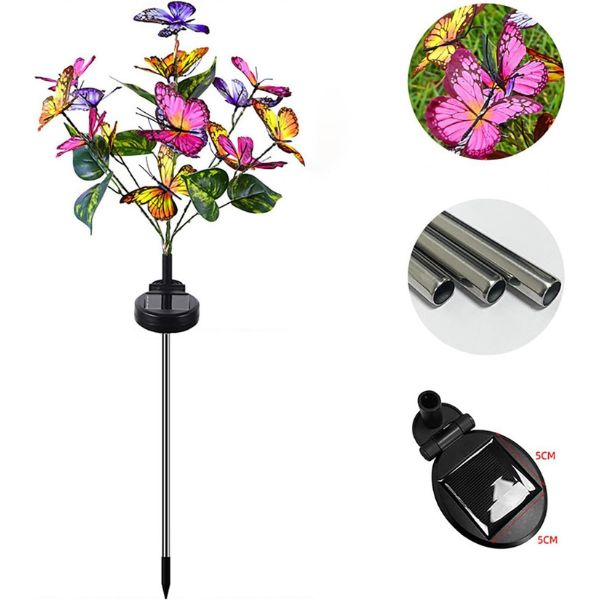 Vďaka realistickým motýľom a rôznofarebným rozprávkovým LED svetlám tieto záhradné svetlá na solárny pohon určite oslnia a potešia. Svojím jedinečným dizajnom dodajú vašej záhradnej výzdobe rozmarný nádych. Svetlá LED sú energeticky úsporné a vyžarujú teplú, lákavú žiaru.