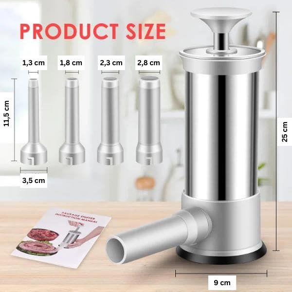 Tento plnič klobás obsahuje štyri PP dýzy s rôznymi priemermi: 1,3 cm, 1,8 cm, 2,3 cm a 2,8 cm.