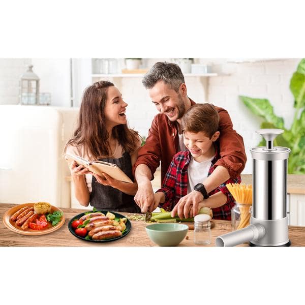 Tento plnič mäsových klobás, vybavený 4 PP dýzami a 2 kefkami, je ideálny na sviatočné oslavy a rodinné stretnutia.