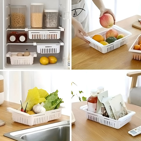 - Zavesiteľný kôš do chladničky: Efektívne využitie štrbín v chladničke. Kôš je možné zavesiť na police v chladničke.